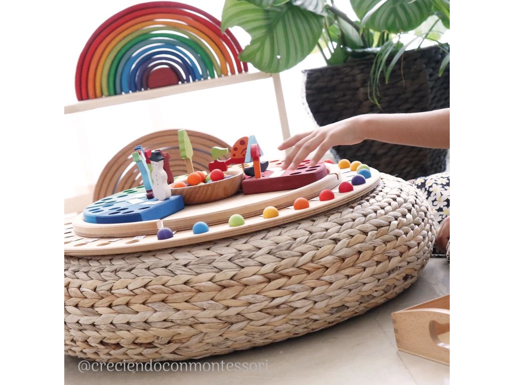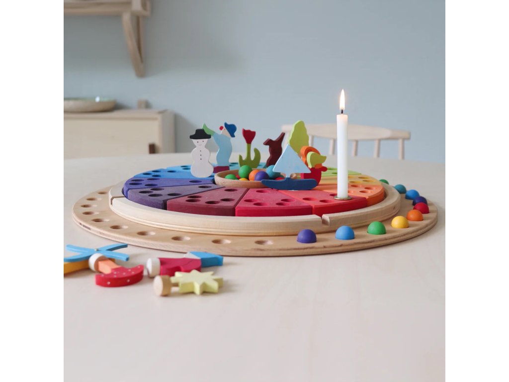 Kruhová podložka pro roční kalendář je promyšleným doplňkem ke Kolu roku , které lze umístit do jejího středu. Tato kombinace vytváří komplexní systém pro sledování plynutí času s dětmi, který podporuje jejich orientaci v dnech, týdnech i měsících.